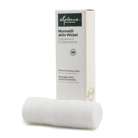 Die Alpienne Wickelbandage ist mit einer pflegenden Essenz aus Murmeltieröl und Lorbeerblätteröl durchtränkt. Sie kann als Teil einer entspannenden Hautpflege-Routine verwendet werden – zum Beispiel nach körperlicher Aktivität.