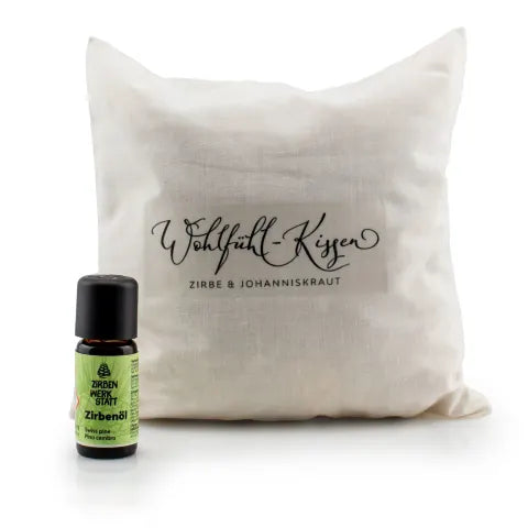 Das Wohlfühl-Set besteht aus einem Zirben-Kissen mit 20x20 cm und einem Zirbenöl. Befüllt mit Zirbenflocken sowie Hirse aus biologischem Anbau und mit einem Extrakt aus Johanniskraut angereichert.